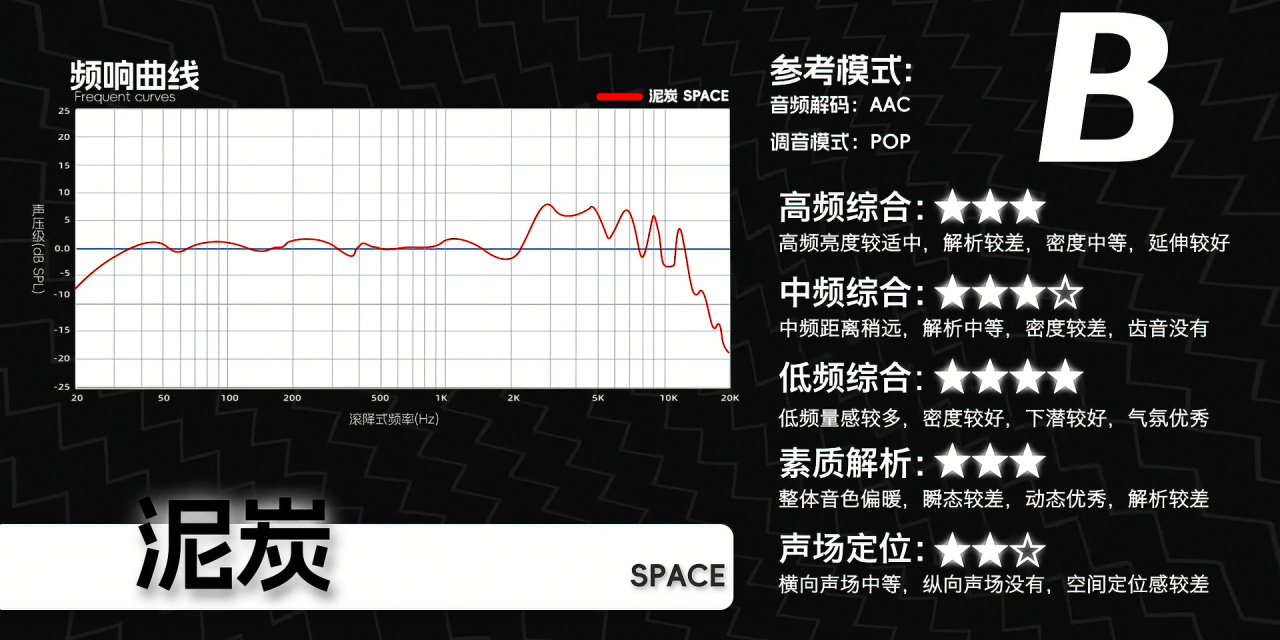 SPACE的高频亮度适中,解析较差乐器混成一团,密度不错,质感柔顺,泛音较多,延伸不错。人声的距离稍微有些远,口型较为模糊,质感稍有润泽感,胸声比较饱满,气声和齿音几乎没有。低频量感较多,解析一般,密度不错,非常凝聚有力,肉感凸出,下潜不错,打击感很深,动态感也能够表现。声场不算小,但是非常贴耳,总的来说,是偏中低频的流行向耳机,适合听一些hippop或者欧美流行乐。