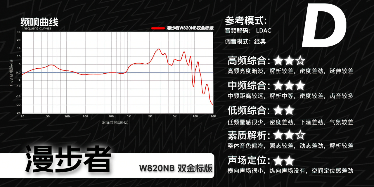 漫步者 W820nb的高频解析差劲,乐器结像模糊,有很明显的干虚紧涩感。人声稍微拉远了些距离,尖锐且虚薄,有很明显的颗粒感,齿音凸出且突兀。低频完全是敲塑料皮的程度,质感量感下潜气氛要啥没啥。声场在脑内挤成一小团,整体的听感凸出一个干冷薄刺虚,难听。