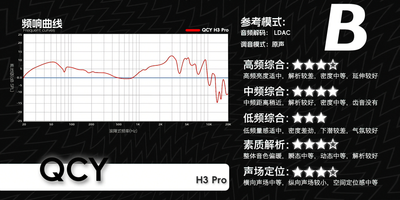 H3Pro的高频亮度适中,解析中规中矩,勉强能够还原乐器结像,质感柔顺且软散,高频延伸不错,泛音丰富,弦乐音色较为优美。人声较为贴耳,口型较大,解析不错,对人声口型能较为清晰的还原,质感较为润泽,没有出现颗粒感,齿音控制较好。低频量感适中,解析较差,鼓声轮廓糊成一坨,低频下潜较差,鼓声砸不下去只有上半截,气氛包裹感较为不错。声场的规模感还不错,比较适合用来听抒情向的流行音乐。