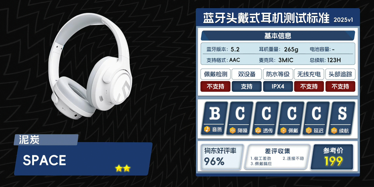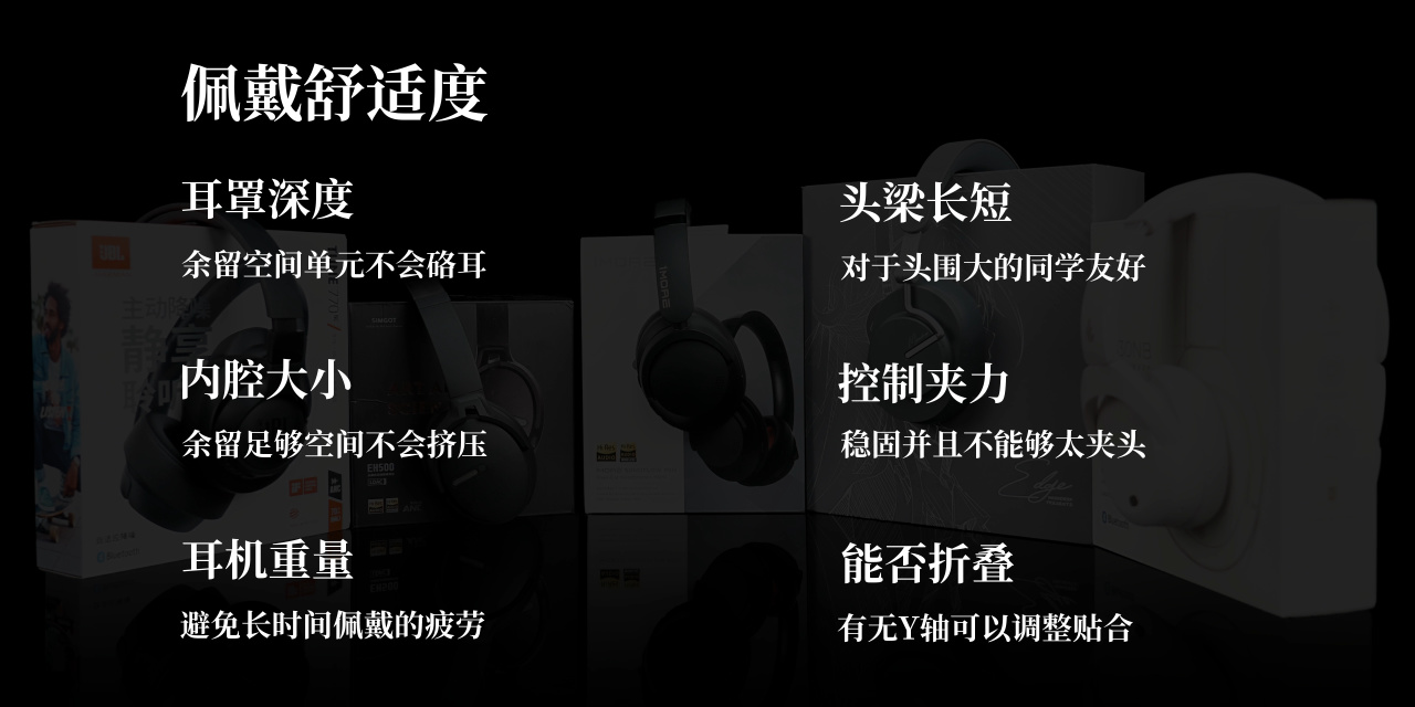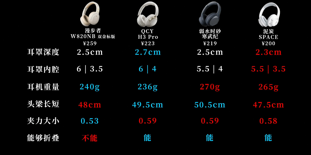 总的来说,QCY H3 Pro的表现最为出色,几乎各项参数都是最佳,实际的体验中也非常舒适,我的W820nb,得益于松松垮垮的塑料头梁,在重量和夹持力上会比其余几只稍好,寒武纪稍重一些,不过较长的头梁对头大的同学比较友好,SPACE的问题就有点多了,膈应压耳还夹头,不太适合长时间的佩戴使用。