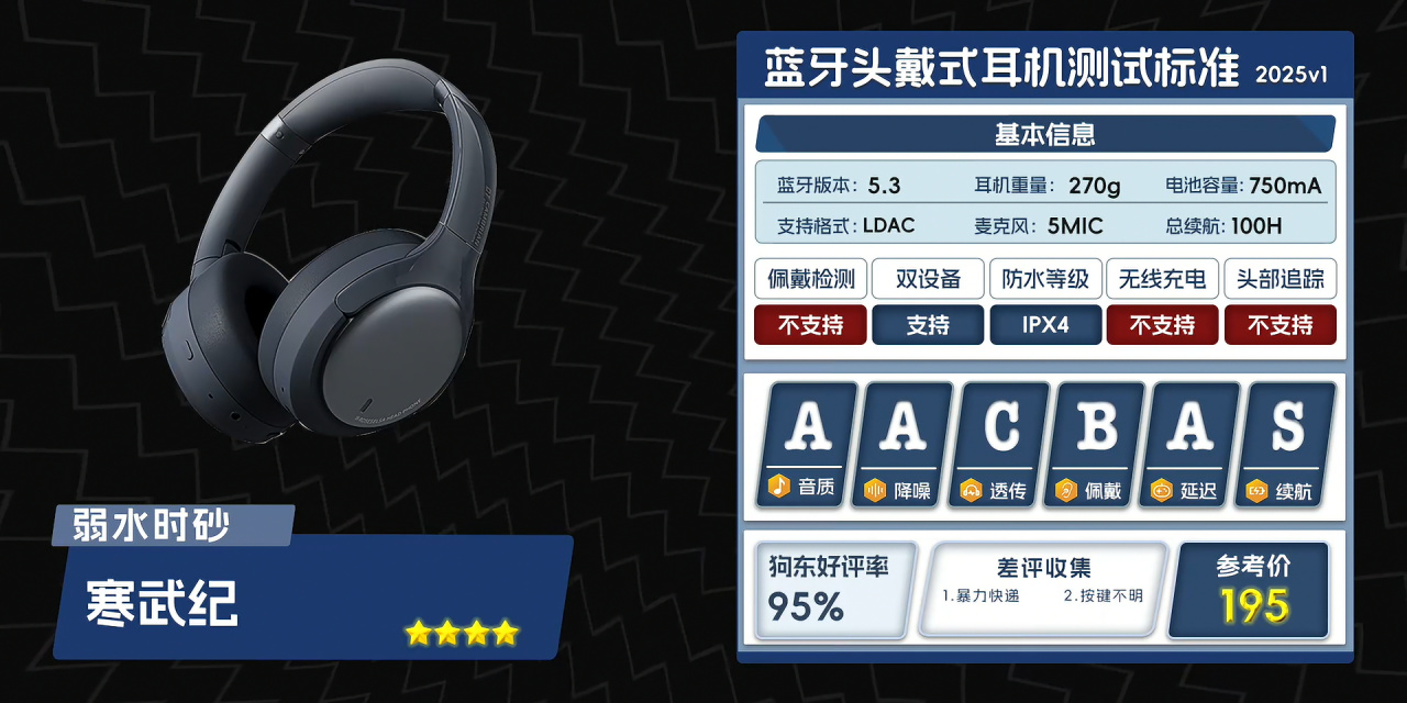 这次测评下来,我会比较推荐弱水时砂 寒武纪,作为弱水家试水蓝牙头戴市场的第一支耳机,在配置层面上给足了诚意,做工质感、主动降噪、声音表现、续航电池基本上都是同价位佼佼者水平,周边的功能也都配备齐全,唯一要吐槽的地方就是佩戴的夹持力稍大,到手后建议用耳机盒撑一撑。