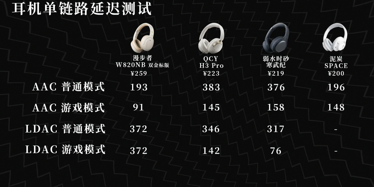 然后是延迟的测试,比较意外的是,寒武纪在LDAC下的延迟优化居然做的比AAC模式下好。W820NB 双金标版在AAC模式下表现不错,单链路延迟100毫秒内基本上玩任何游戏都没有太大压力,剩下两个只能算是勉强及格。