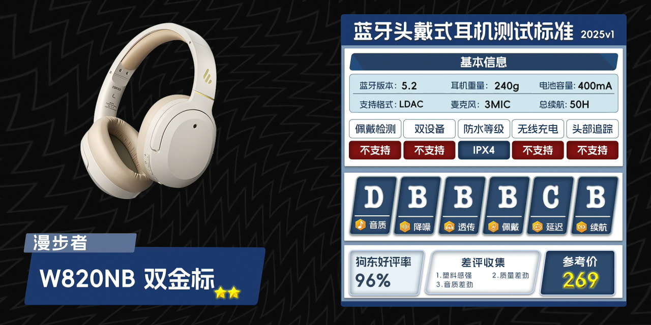漫步者W820nb双金标版就不推荐了,我最开始还以为是普通版,测下来的综合表现以及用料质感也是这次测评里最磕碜的,没想到售价居然还是最高的,W830NB一直是我在推荐的机型,真没想到这俩差距这么大。