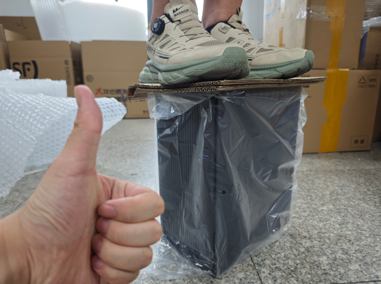別看機箱小,它鐵皮很厚實、結構耐糙!200斤的壯漢踩上去紋絲不動,平時墊着取高處的東西還是不錯的: