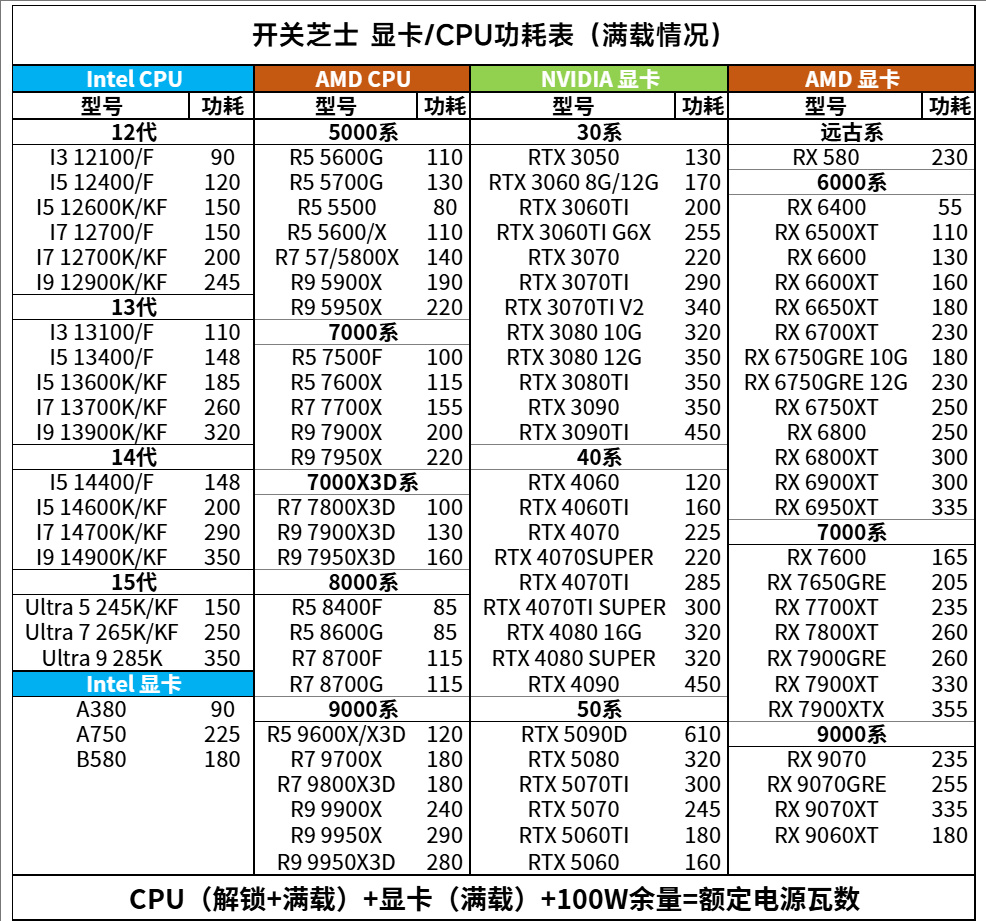 要是再省點,300W電源都綽綽有餘,但與其選擇100元出頭的300W其他電源,不如選擇玄武的500W更有性價比,未來可直接加裝5060TI這種級別的獨立顯卡,可參考電源功耗表: