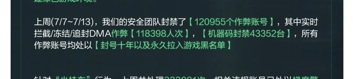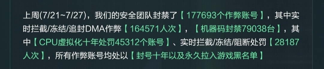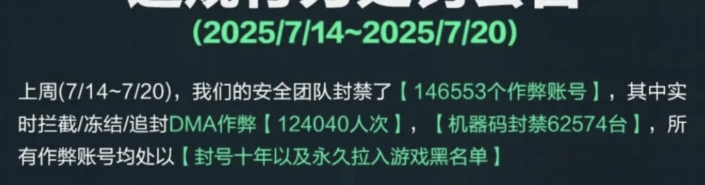 7月7號開始這周封禁了12萬次dma相關作弊行爲