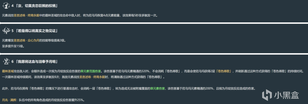 持续期间,队伍中附近的角色触发月绽放反应时,为附近的当前场上角色恢复生命值,回复量相当于菈乌玛元素精通的500%,该效果每2秒至多触发一次。