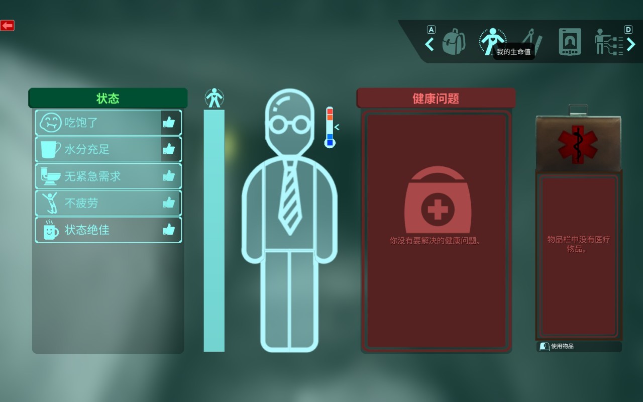 这款游戏的生命系统及其丰富:生命值、体力条、受伤情况、温度甚至是膀胱值都考虑进去了,前期手无寸铁的我们开荒比较困难,需要考虑的事情很多,想要收集的物品也有很多,极其有限的背包栏位很大程度上限制了我们探索的脚步,所以如何更合理的安排我们的背包与精力成为了新手玩家必须学会的课程。
