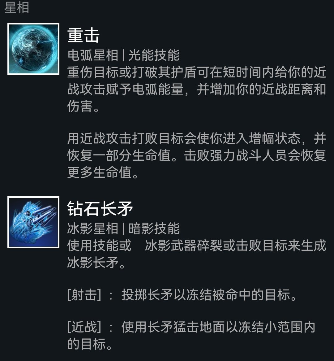 所以星象我們選擇重擊,增加近戰傷害和回血,另一個可以帶鑽石長矛補點控制順便回暗影超凡能量,也可以堅不可摧保命,因爲不常用職業技能不刻意堆職業屬性,所以職業技能回的比較慢,不推薦勇士之鞭。