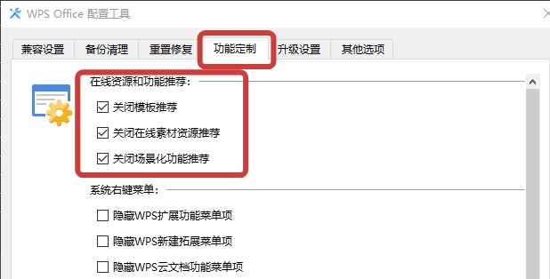 选择功能定制,将这三个勾起后点击确定这样WPS就优化好了