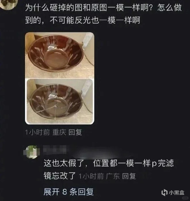同样,AI也能帮你证明一个盆到底被没被砸碎,碎裂程度通通由退款人指定,反正在高科技的加持下,不管是裂缝的透视关系,还是整体的光影效果,都能做到几乎没有瑕疵。非要有瑕疵的话,那还是人的瑕疵——要是把原图也一并发过去,那两张图一模一样的反光,可就彻底露馅了。
