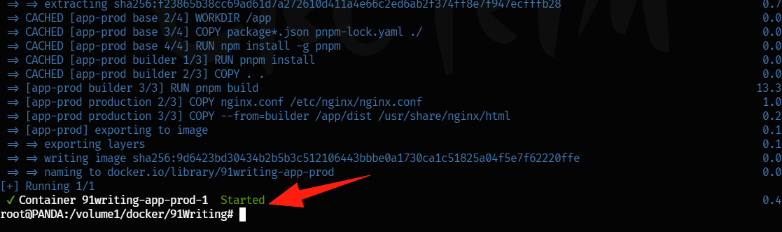 隨後我們再輸入docker compose --profile prod up -d來部署生產環境,也就是項目的鏡像,一樣的會跑一會兒代碼,等待出現這樣的提示就可以了。