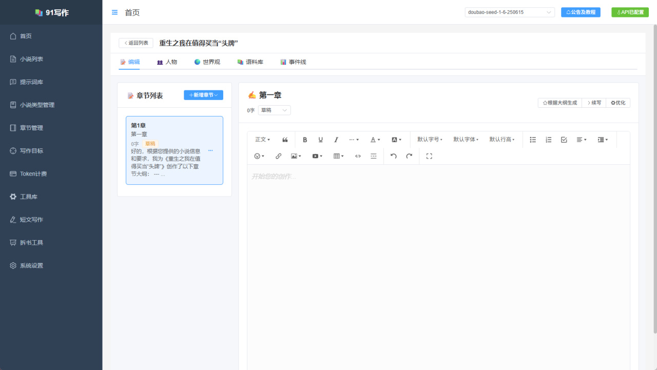 最後的語料庫和事件線咱們就不折騰了,回到編輯界面,選擇創建第一章,直接看看在所有內容都是AI生成,咱們只取了個標題的情況下,AI能寫出什麼樣的小說。(大綱也直接AI生成)