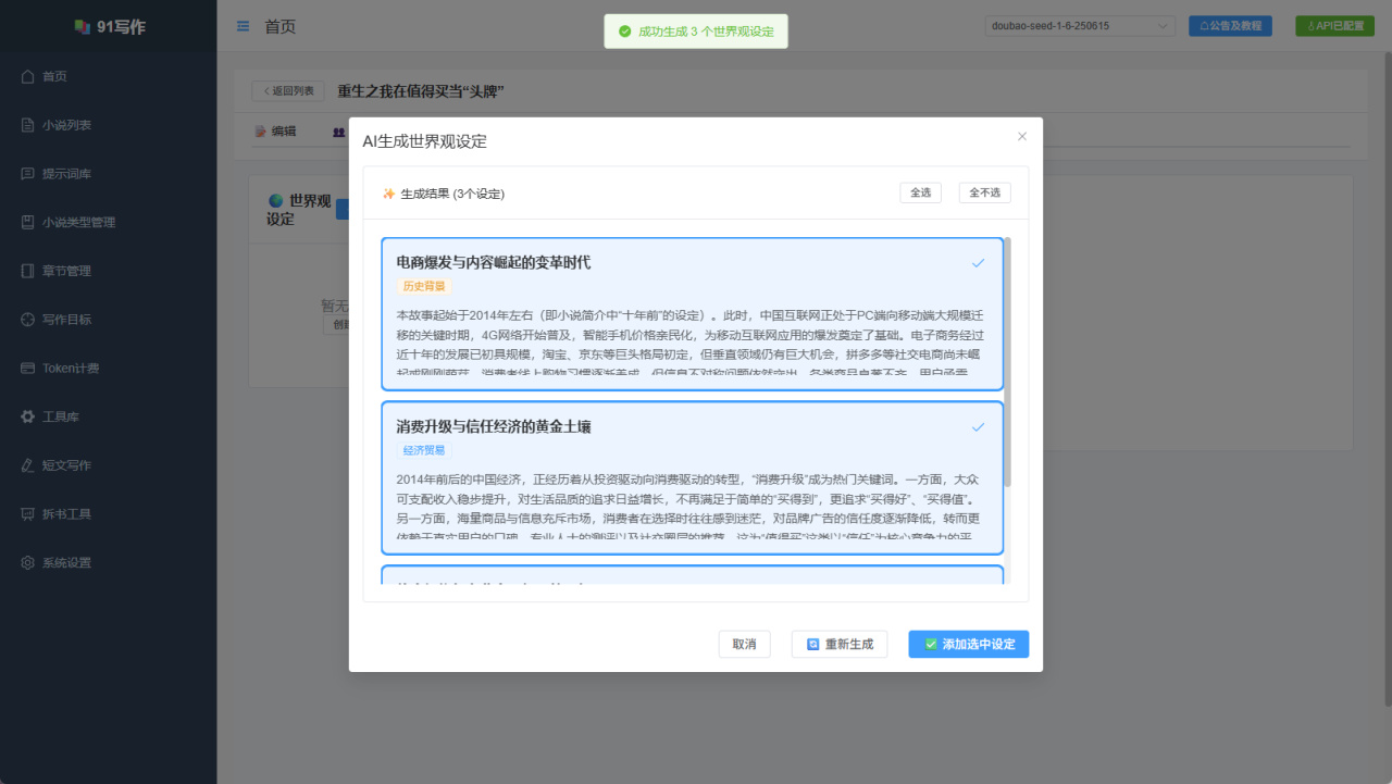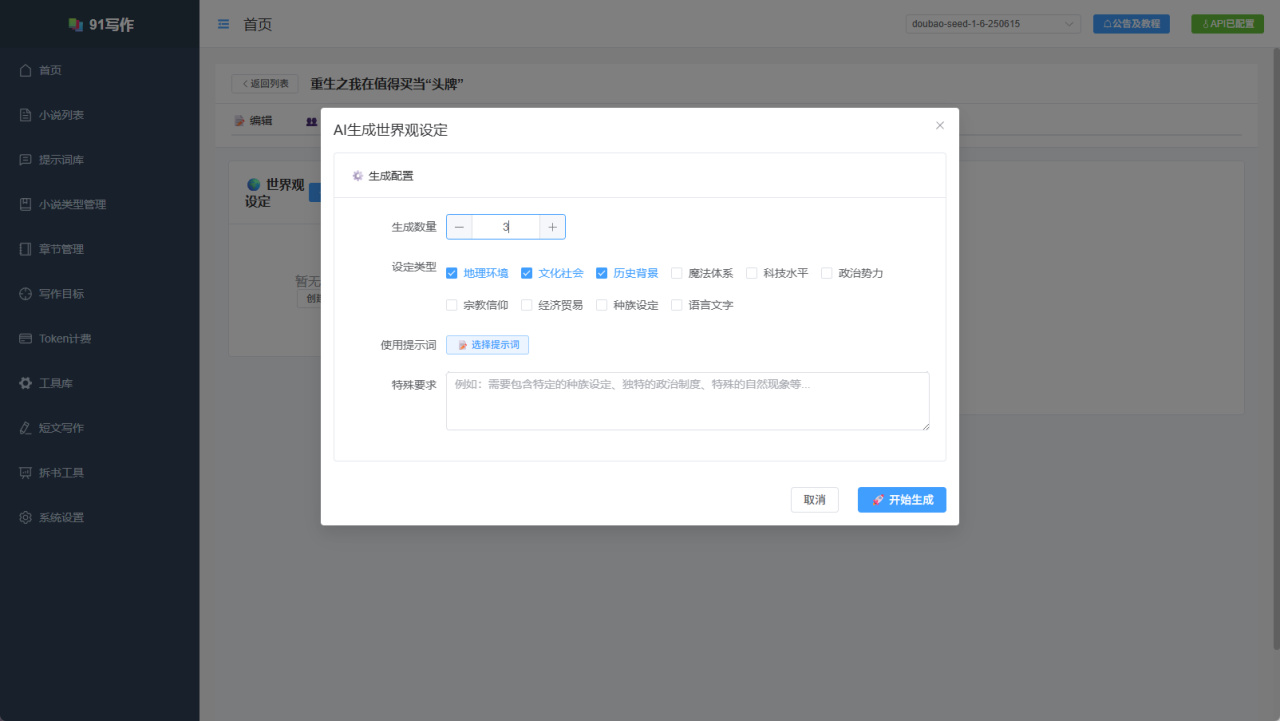 有了人物我們再來創建世界觀,這裏依然支持AI創建,還可以選擇設定類型,例如地裏環境、文化社會、歷史背景、魔法體系以及經濟等等,再宏大的世界觀應該都能搞定。