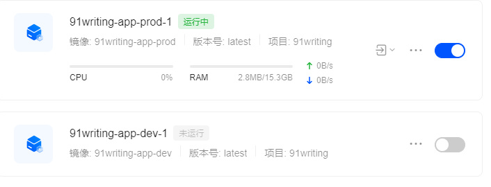 這時候我們回到綠聯的Docker界面,能看到運行環境已經正常在運行了,開發環境在運行環境部署好之後會自動停止,不需要管他,也可以直接刪除。