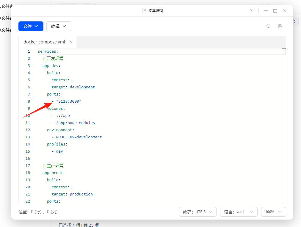 項目下載好之後放到我們NAS的Docker文件夾中,直接打開docker-compose.yml文件,修改其中的端口,因爲作者默認放開的端口有80,所以我們需要修改一下,同時也看下其他端口是否有衝突,有就一併修改了。