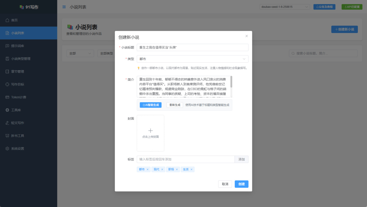 點擊左側的小說列表,熊貓要開始寫我的第一部小說了,名字就叫重生之我在值得買當“頭牌”,選好類型之後簡介也能直接AI生成,生成出來的簡介很有“味道”,我感覺我已經無敵了。