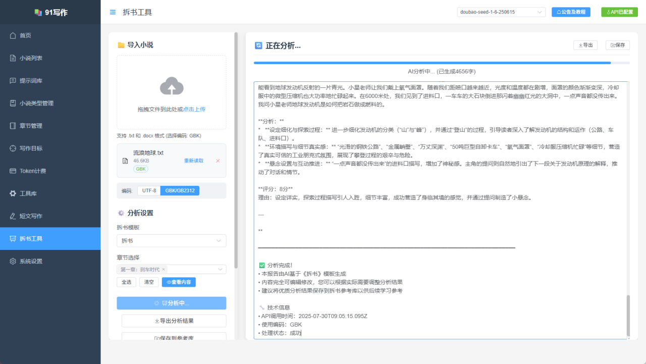 當然,除了小說創作,項目還支持短文寫作以及拆書工具,第一個很好理解,第二個其實就是將已經有的文本文件上傳,隨後進行AI分析拆解,不得不說這工具有點厲害。