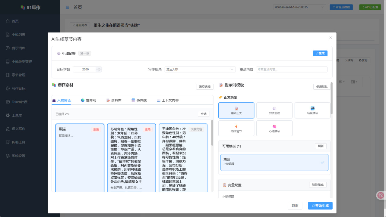 點擊右上角的根據大綱生成,隨後讓我們選擇這一章需要參加的人物、世界觀等等設置,設置好之後直接生成就行了,這個過程就相對來說很慢了,畢竟加了很多前置條件。