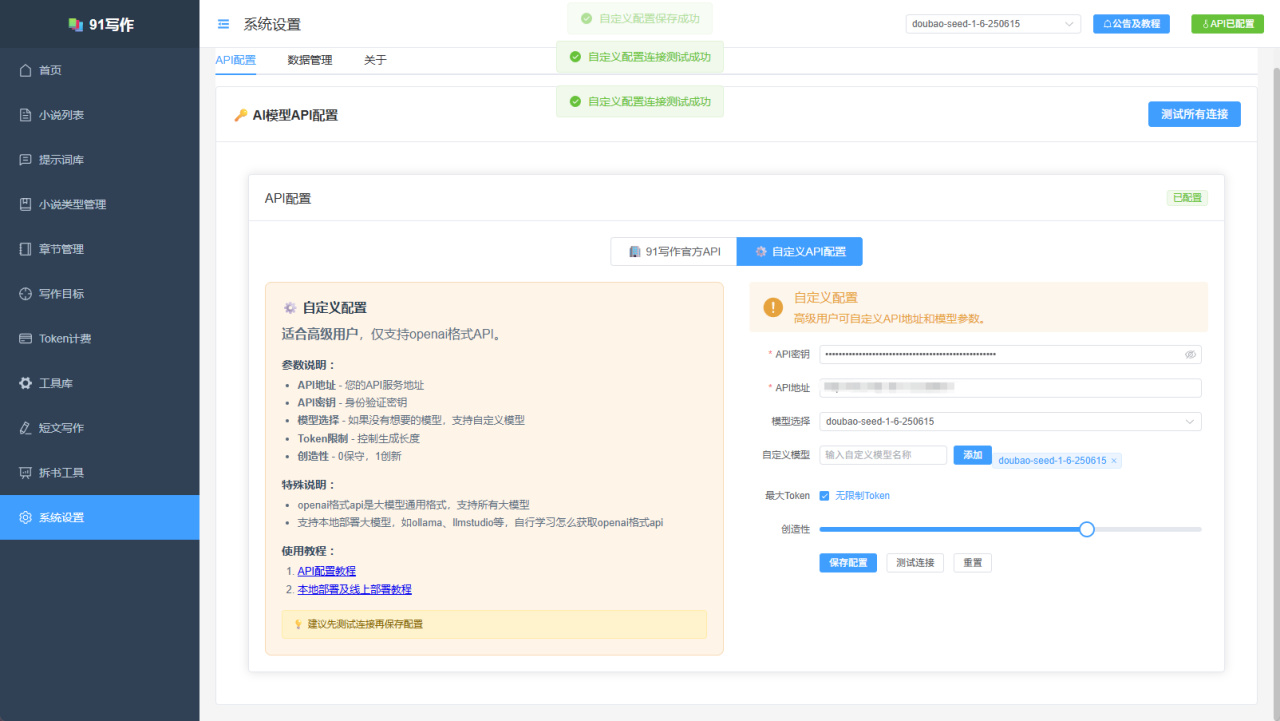 首次使用咱們需要先進行AI的API配置,這個在系統設置那裏就能設置。項目有官方的API可以購買,如果自己沒有API可以支持下,也可以自定義API配置。這裏熊貓用的豆包的模型,配置好之後測試是正常的。