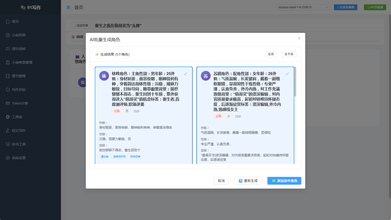爲了更快的出作品,這裏熊貓只創建了一個主角,其他人物都通過AI進行生成了,生成途中支持退出,讓其後臺生成,生成之後還可以手動勾選,選擇角色,選好之後也能再次編輯優化。