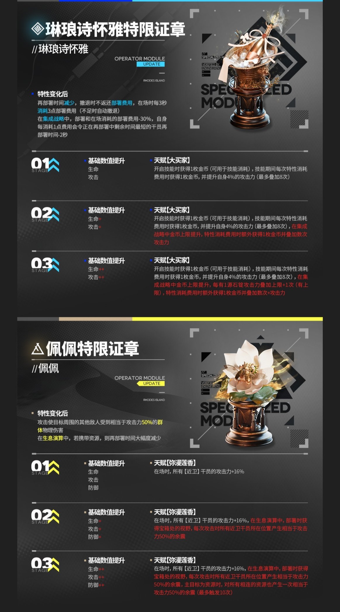 还是集成战略的有意思。诗怀雅这个减少30%消耗并且消耗费用使得剩余时间最短的干员-2秒。配合特种减再部署藏品可以超快回转。每有1源石锭叠层上限增加,可惜有上限,不知道能不能大方一点比如100层以上。而且消耗费用额外1金币并且叠加数字攻击力,这至少叠个2-3层吧。如果大方的能给100层,3技能一次发射100枚金币想想就爽。但是看之前特限很多50%攻速50%攻击的。感觉能叠50层就差不多了。