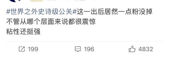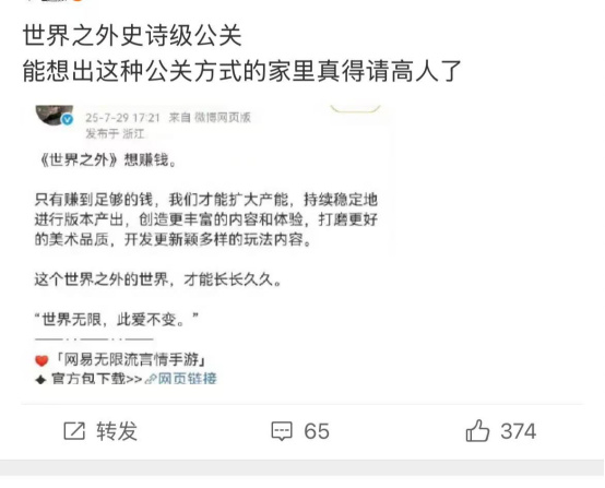 從幾次事件的連鎖反應來看,玩家對《世界之外》的信任似乎已經沒那麼多了,信任的建立需要長期積累,但一次輕率的決策、一次敷衍的公關就可能讓多年積累化爲烏有,微博熱搜上#世界之外史詩級公關#被無數玩家拿來調侃。