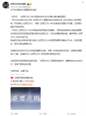 前段時間7月11日bw正在火熱進行,當日中午,《世界之外》官方微博突然發佈一則消息,稱因公安管理要求,《世界之外》BW 展臺 7 月 11 日的所有場次現已停止排隊。此消息一出,便在玩家羣體中引發熱議。隨後官方詳細解釋,在此次 BW 展會中,主辦方將《世界之外》周圍的排隊區域劃分給了《戀與深空》,但卻未提前告知《世界之外》方面。直到 7 月 8 日搭建時,《世界之外》BW 負責組才驚覺該區域已被分配給其他展商,由於涉及多項流程且運營方案已向玩家公示,難以再做調整,最終致使排隊區域不足 。