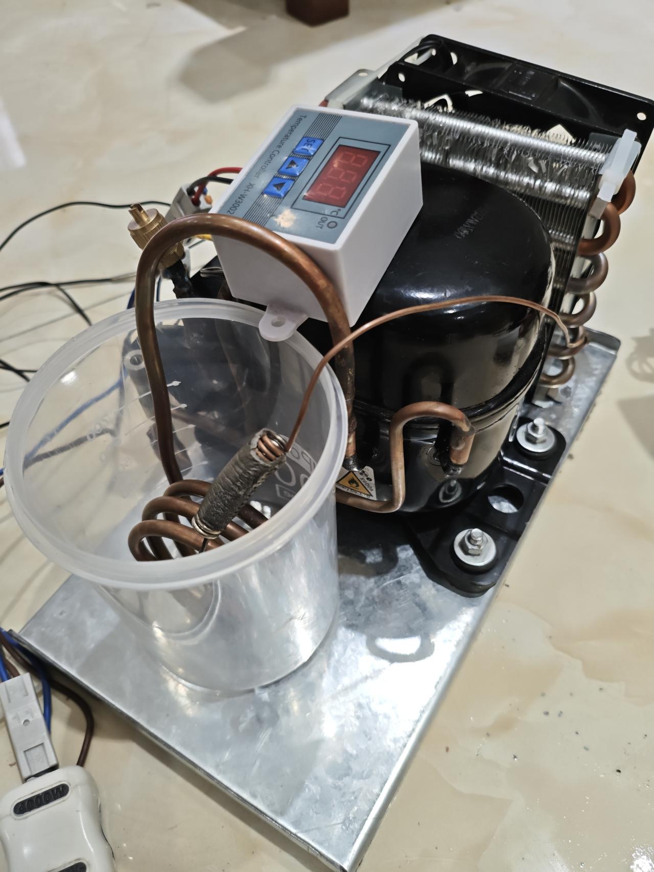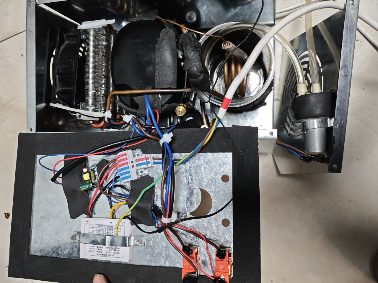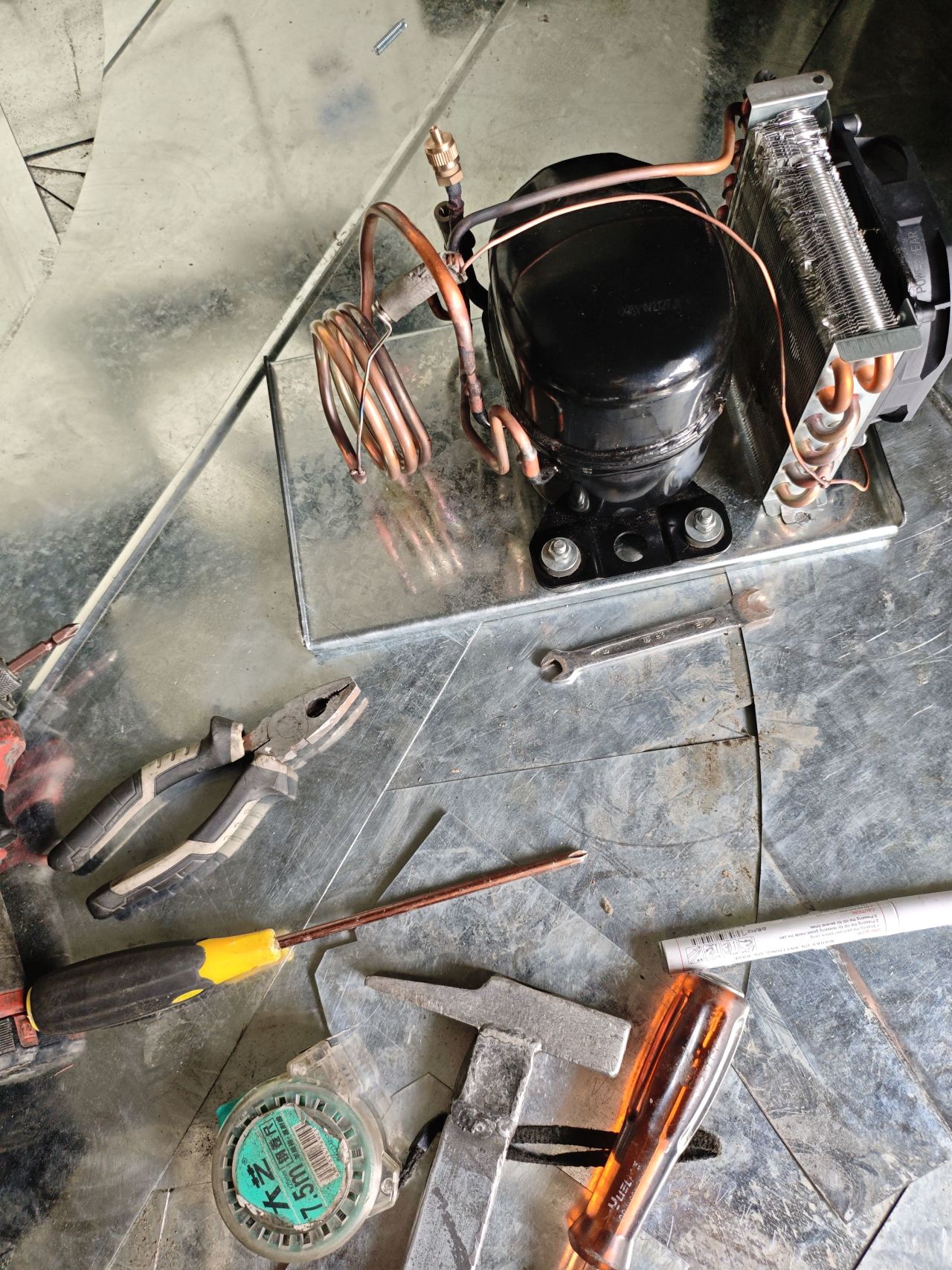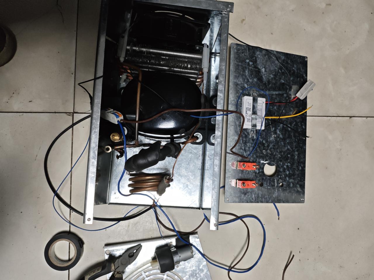 原来的塑料底座给我烧融了。右边的冷凝器类似散热冷排是买来自带就有的,另外买了一个220伏电压的散热风扇,电压和压缩机的相同,方便我后续接电。