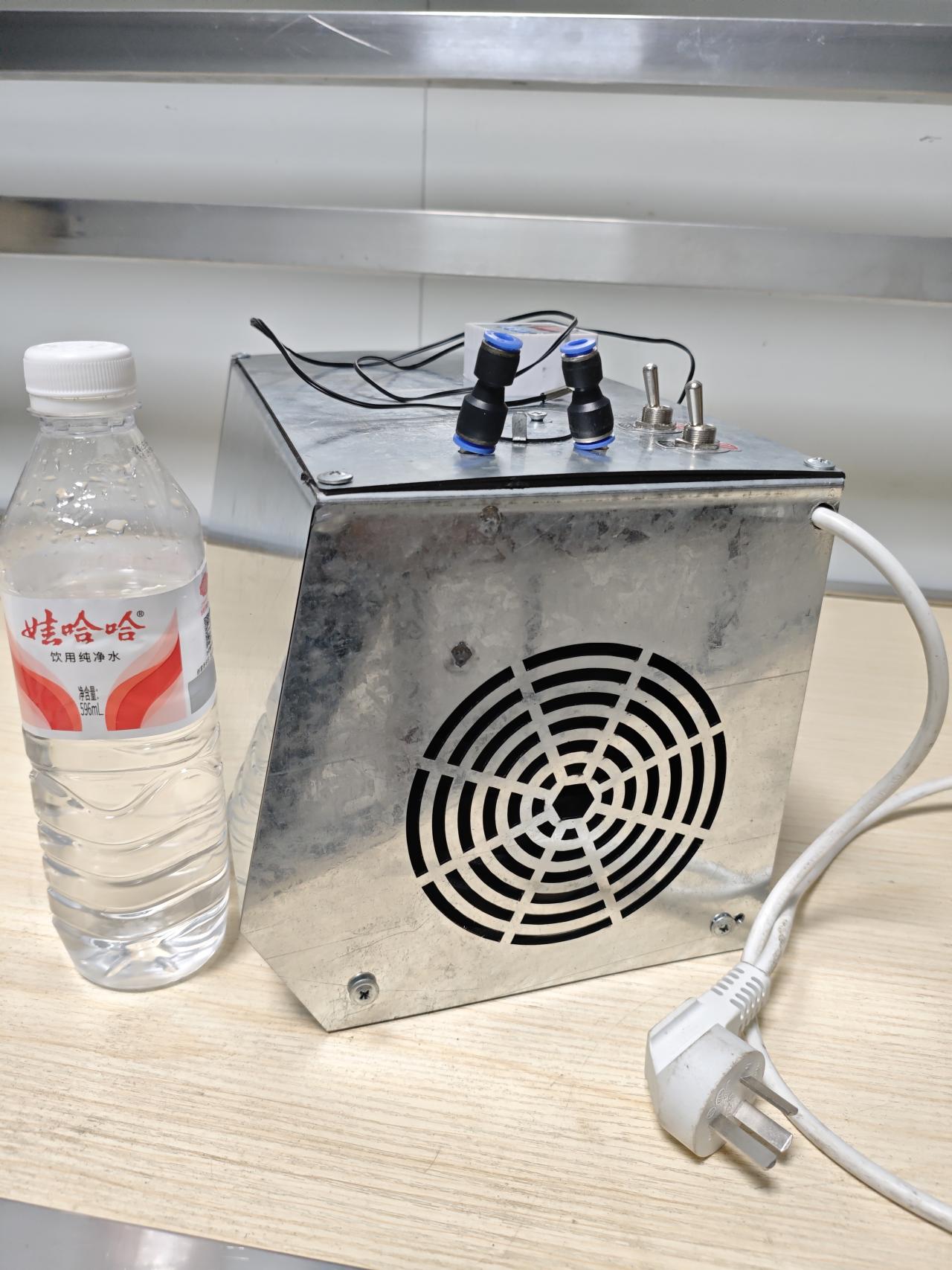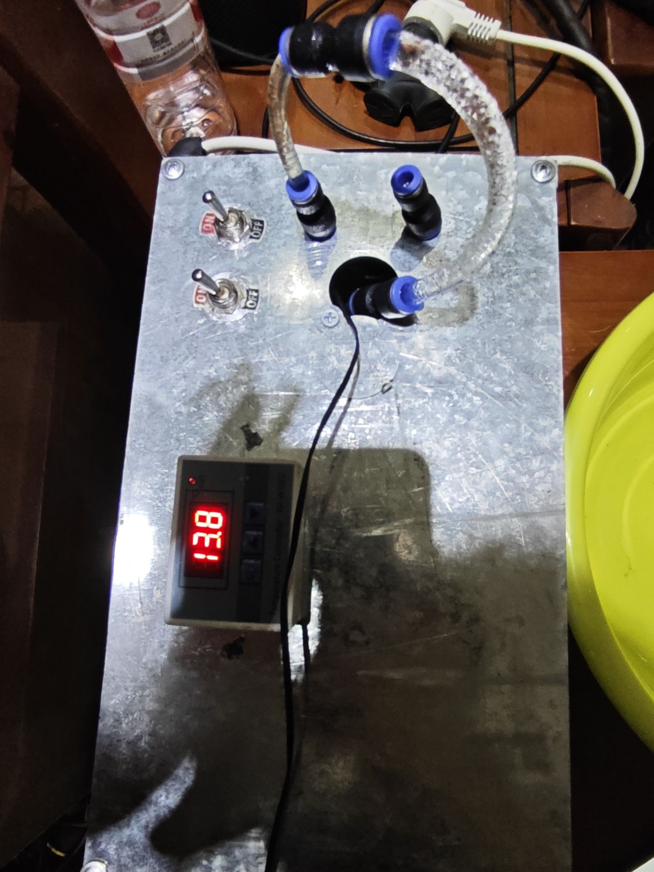 面板上右边那个摇头开关是控制风扇和水泵。左边的摇头开关控制压缩机通断,压缩机又由温控器控制启停,另外两个快接头是出水口和进水口,旁边那个圆片是注水口。