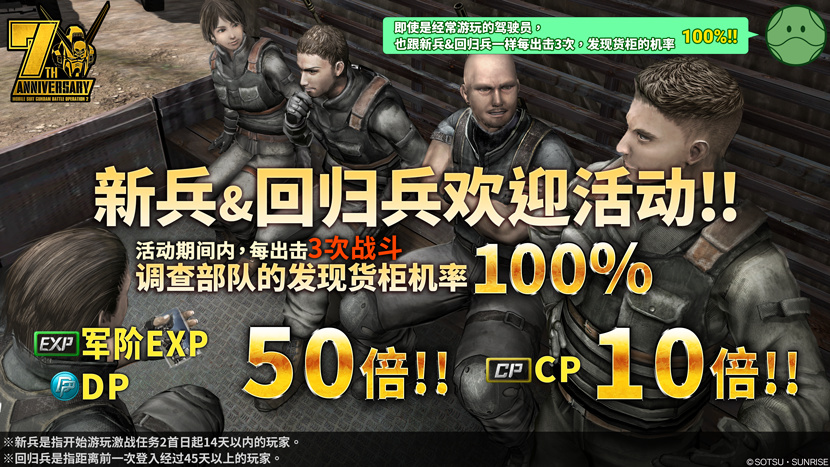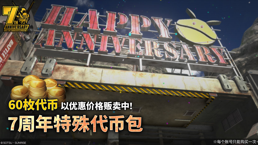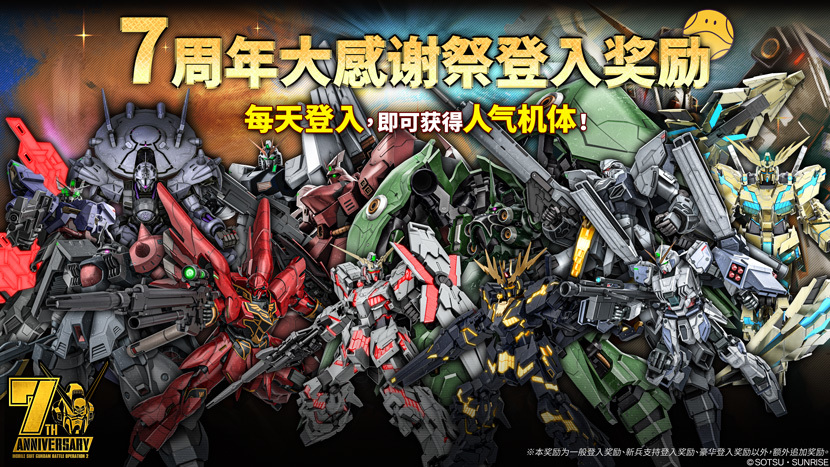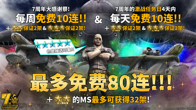 包括「海盗高达X1改保证STEP UP抽选配给」、每次保证获得4架2星以上机体&最多可进行80连免费抽选的特别抽选配给、赠送包含「感谢39代币」、总计50架机体的7周年纪念集装箱、可获得4星机体如「独角兽高达 LV1」、「报丧女妖 LV1」等7周年大感谢祭登入奖励、新兵与回归兵的EXP和DP为50倍、CP为10倍的「新兵&回归兵欢迎活动」等,请务必确认下方详细内容,别错过这次盛大的周年庆典!