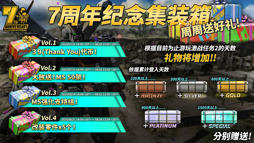 为庆祝『激战任务2』迈入7周年,自2025年7月31日(四)14:00<JST>起,将每周赠送7周年纪念集装箱