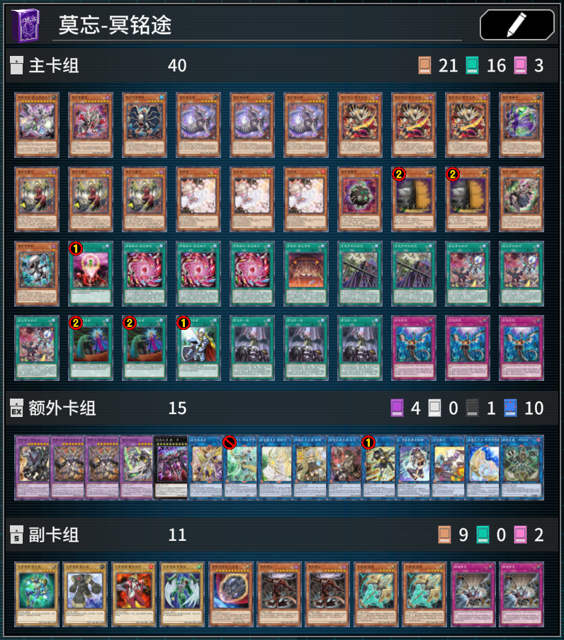 终场:冥骸王-莫忘冥府亡灵+冥骸合龙-莫忘冥地亡灵+I:P伪装舞会莱娜+莫忘角魔龙+冥骸融合-莫忘融合(后场速攻魔法)+莫忘骨头派对(后场速攻魔法)+莫忘心钥精(手卡)。
