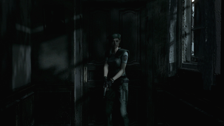 觉得这一张的月光从窗户处打进来,年轻的吉尔持枪准备前行,谁知道前方有什么怪物呢?我当时没有操作,看着吉尔驻足的造型就觉得很像一幅画。我也想起来当年在土星上玩这款游戏时,在某个谜题处要弹奏钢琴。如果选用克里斯因为他不会弹钢琴就只能走另一个分支,如果选吉尔就可以弹奏了,弹奏的曲目正是《月光》(心里一直以为这个音乐应该是索尔的《B小调练习曲》可实际上是贝多芬的《升c小调第十四钢琴奏鸣曲》第一乐章,这大乌龙摆的。)我觉得曲子跟这张截图也很贴合。