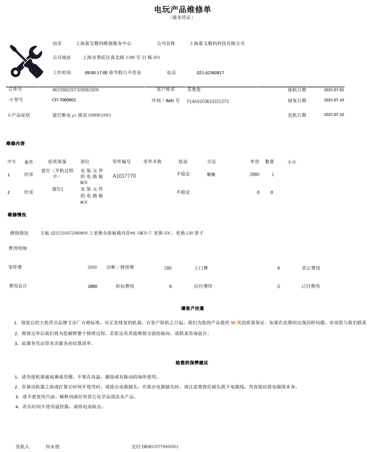 直接上结果,维修费用2880元,邮费共计53元,本次维修总计费用2933元