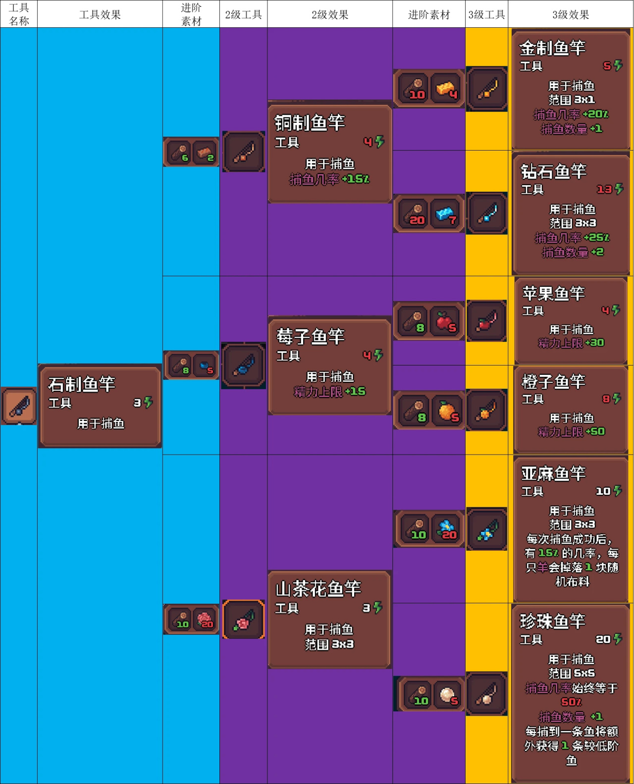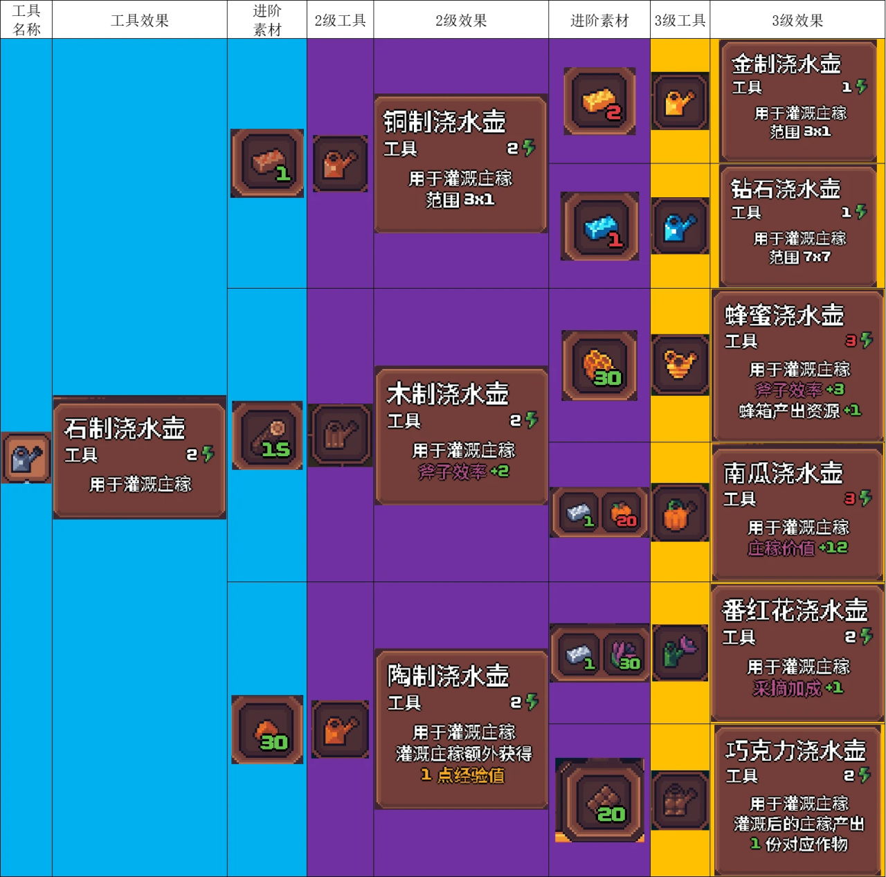 對了,大多數時候,農具升級不僅要獲得對應的素材(某些素材只有開啓特定地區後纔會開啓),而且還要農具積累足夠的經驗值,才能選擇升級。