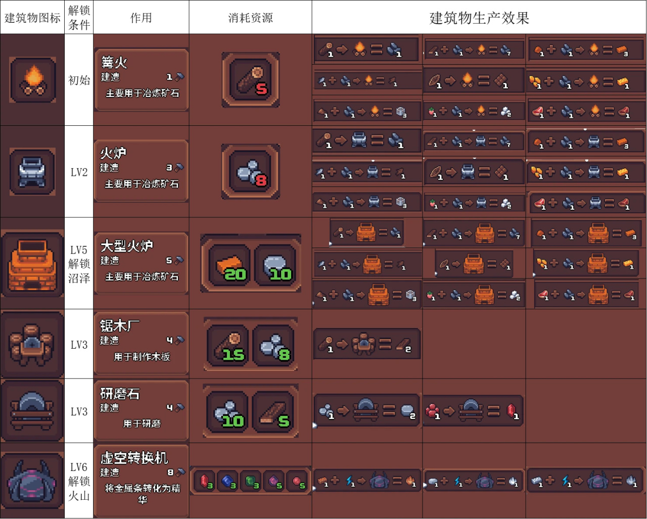 冶煉板塊,能夠燒炭、冶煉礦石,製造木材,打磨石塊、寶石。其中篝火、火爐、大型火爐的效果相同,但單一的建築一次可處理的材料數量不同。