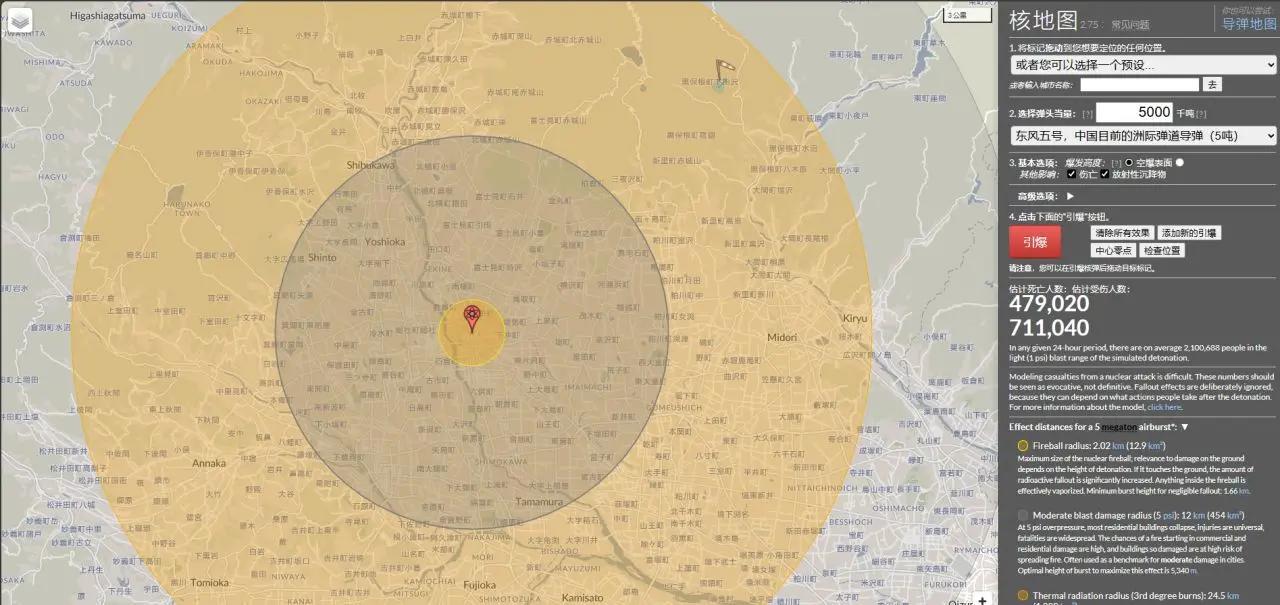 这是一个能模拟核弹爆炸的交互式网站,你可以选择全球任意地点指定你想测试的核弹威力,从广岛小男孩儿到历史上最强大的沙皇炸弹,他都能清晰地展示爆炸产生的热辐射,冲击波,火球甚至放射性尘埃的覆盖范围,让你瞬间感受核武器的毁灭性威力,更变态的是它还能估算出爆炸造成的具体死亡和受伤人数,让你直观理解核武器的真实破坏力