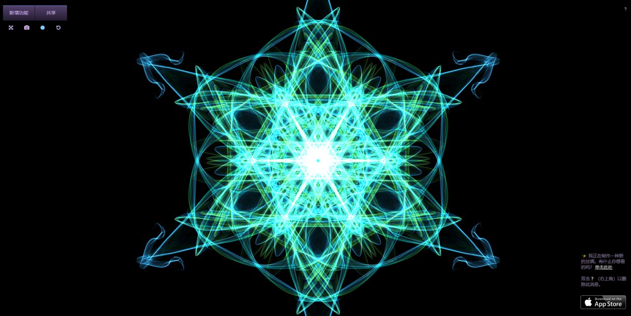 这是一个超级解压的网站,你只需要用鼠标在屏幕上滑动就可以生成这样的对称粒子发光画点左上角按钮,还可以修改画笔的颜色和修改画笔的数量,甚至还可以生成一个链接,进入后里面展示了你绘画轨迹的全过程