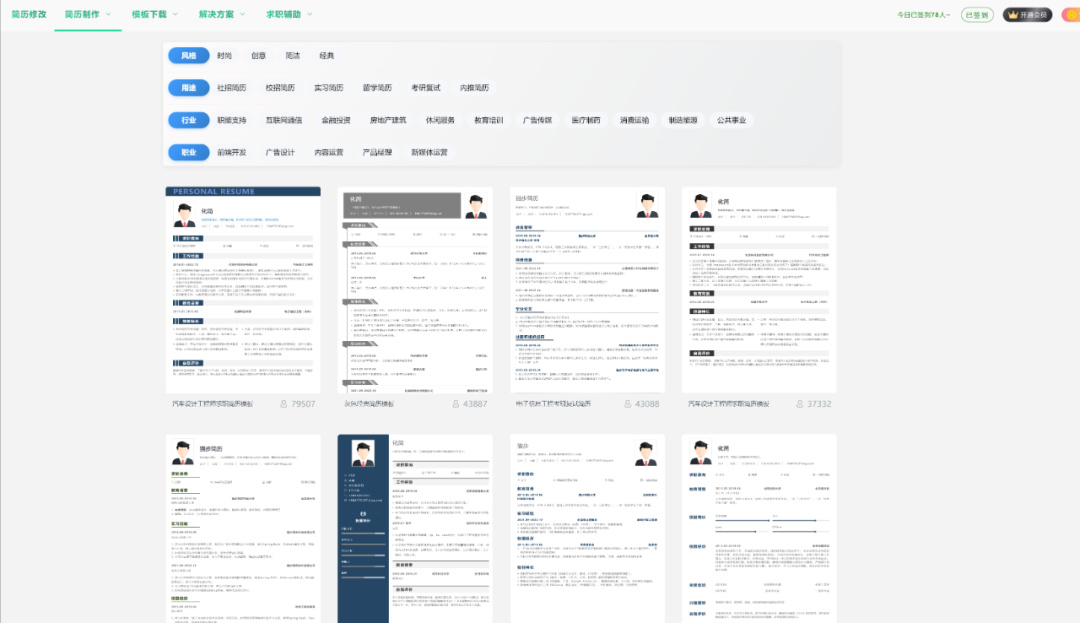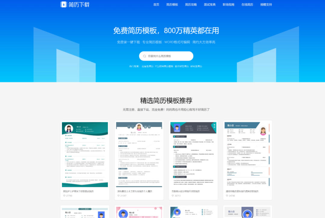 这是一个完全免费的简历模板下载网站,甚至都不需要注册,也没有广告,打开就能下载,可以按行业、岗位、人群或风格筛选,直接下载Word格式文件,然后用 Office、WPS二次编辑。除了中文简历外,还提供了部分英文简历模板,此外还提供了简历攻略、面试宝典、职场指南等干货内容。
