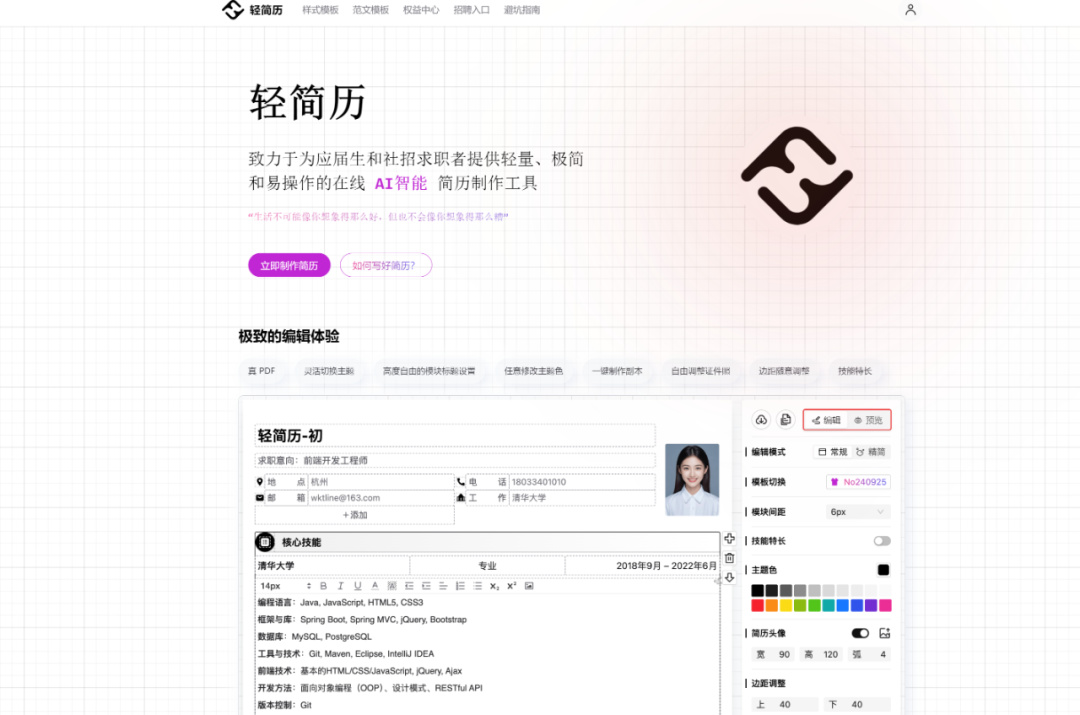 主打“极简、高效、零学习成本”的在线中文简历工具,只提供1页极简模板,支持自动排版,边写边看效果,无需注册,可免费导出PDF,此外还提供了关于如何制作简历的攻略,不过简历模板不多,适合大学生校内求职、介绍。