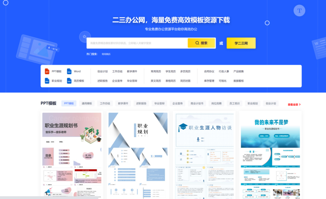 这是一个专注全场景办公模板免费下载的中文资源站,特点是模板多、分类细、全部免费、即下即用。包含PPT、Word简历/合同/报告、Excel表格/数据分析、实用办公素材等,类型丰富,实行0付费、0积分、免注册,直接点击就能下载,不管是做简历还是办公都很有帮助。
