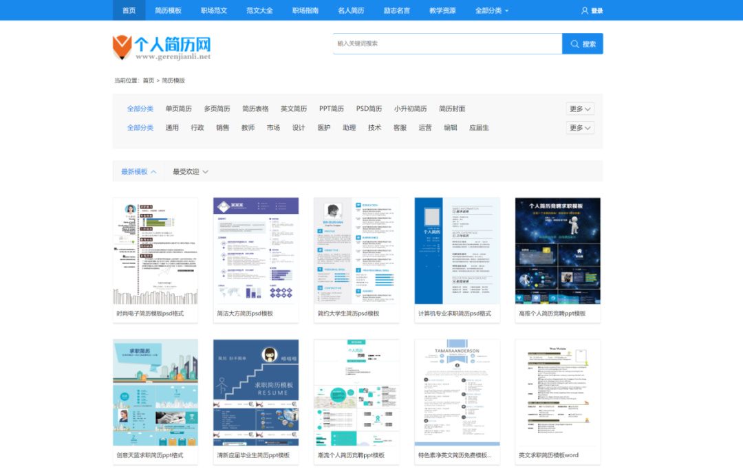 提供了数量丰富的单页、多页、中文、英文、PPT、PSD、Word简历模板,可下载简历封面,分类包含通用、行政、教师、销售、市场、设计、医护等各种领域,需要登录才能使用,可导出PDF。此外,还有创业计划书、自我介绍模板及面试礼仪、职业规划等内容。