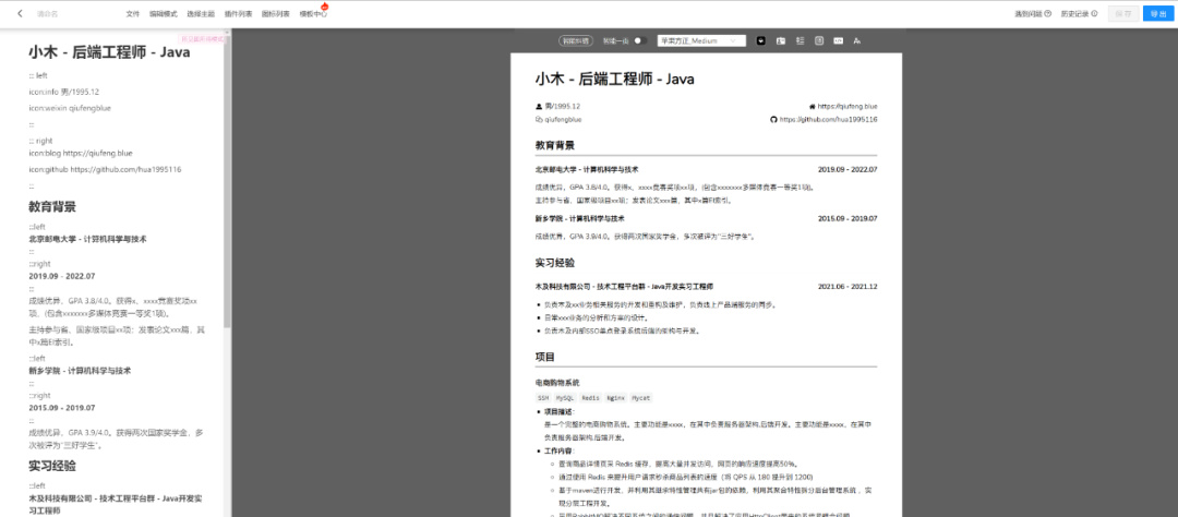 这是一个免费在线制作简历的网站,其Slogan为“只为一份精美简历”,极大降低了简历排版的难度,打开就能使用,通过一页式编辑快速调整内容,所见即所得,数据只存在浏览器,服务器不留底,支持导出PDF、Word、PNG等格式,不用担心乱,不过模板很少。