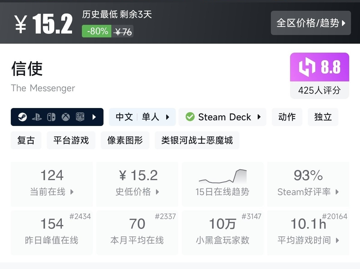 像素银河城杰作!时空切换机制革新关卡设计,忍者跑酷与Boss战行云流水。Meta评分90,怀旧玩家叹“现代8-bit教科书”。