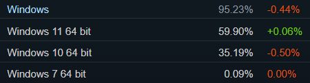 PC操作系統方面,使用Windows操作系統的玩家佔總數的95.23%,這其中Windows 11 64 bit以59.90%的佔比率高居第一,較上月增長0.06%,後續排名依次爲Windows 10 64 bit(35.19%)、Windows 7 64 bit(0.09%)。