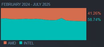 使用英特爾處理器的用戶仍然佔據主流,但佔比減少到58.74%。使用AMD處理器的用戶佔比爲41.26%,增長1.61%,AMD處理器現在正逐步蠶食英特爾市場。