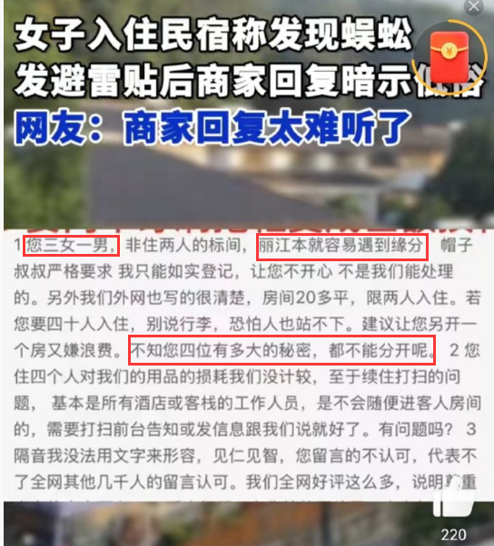 消费者称自己是一家四口入住民宿,妈妈带三个孩子,商家回复称“三女一男",“民警要求严格”,“不知有多大的秘密不能分开”,暗示“丽江容易遇到缘分”,还称房间是2人标间,顾客非要4人一起住。