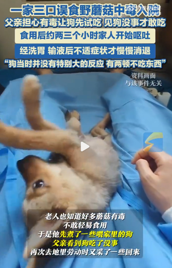 7月30日(报道),四川遂宁,一家三口误食野蘑菇中毒入院,父亲担心有毒让狗先试吃,见狗没事才敢吃,食用后约两三个小时家人开始呕吐,经洗胃、输液后不适症状才慢慢消退。