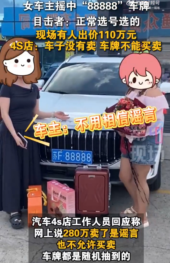 号。拍摄者吴先生表示女车主是外地人,在本地厂里上班的普通人,在车管所通过机器正常摇的,整个大厅的人都凑过去看,普通人能摇到太罕见,现场有很多二手车贩子谈价,最高开到110万,最后车子没卖开走了。
